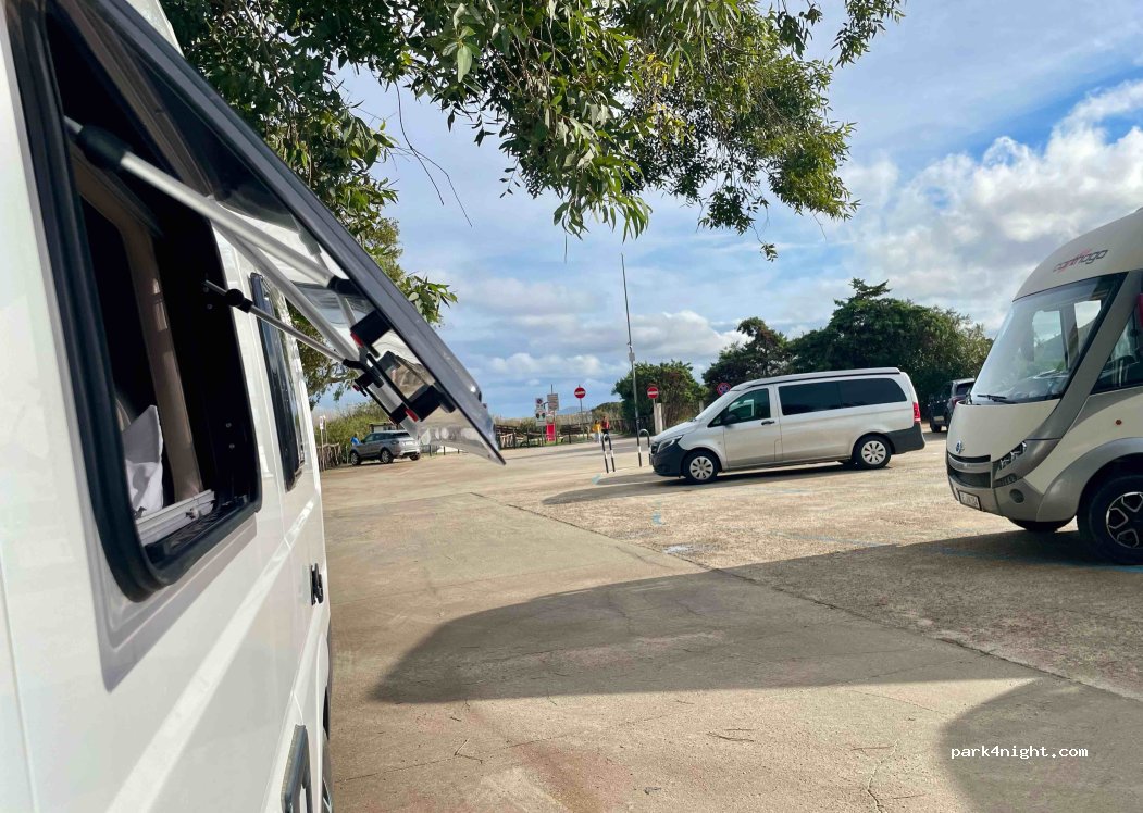 Le parking est très grand et paisible. Très facile à trouver et bien si vous voulez dormir la nuit. La plage à proximité est agréable et venteuse pour le kitesurf et la planche à voile, le vent est très constant et il y a une école pour qui veut l'apprendre. Belle rivière à voir pour une excursion Avec Sup ou Kayak. De très bons endroits pour l'escalade également, et bon marché par rapport au reste de la Sardaigne. l'endroit est payant en haute saison mais le prix est très bon marché. Il y a un grand panneau qui indique clairement que les camping-cars ne sont pas autorisés à se garer ici de 20h00 à 08h00. Combien de fois cela est contrôlé, je ne peux pas dire.