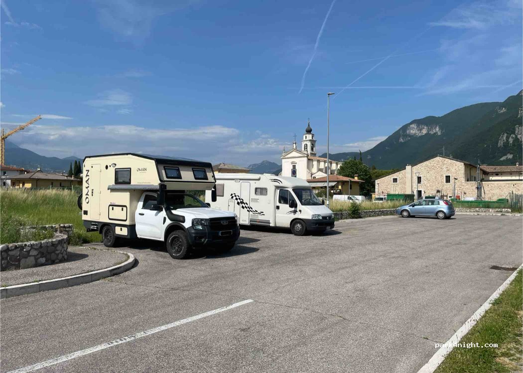 Piccolo parcheggio vicino al parco giochi. Tranquillo giorno e notte. Piccolo market al centro del paese, circa 150 metri. Sono presenti 2 colonnine per l'acqua, una vicina e l'altra a 50 metri di distanza in un altro parcheggio.