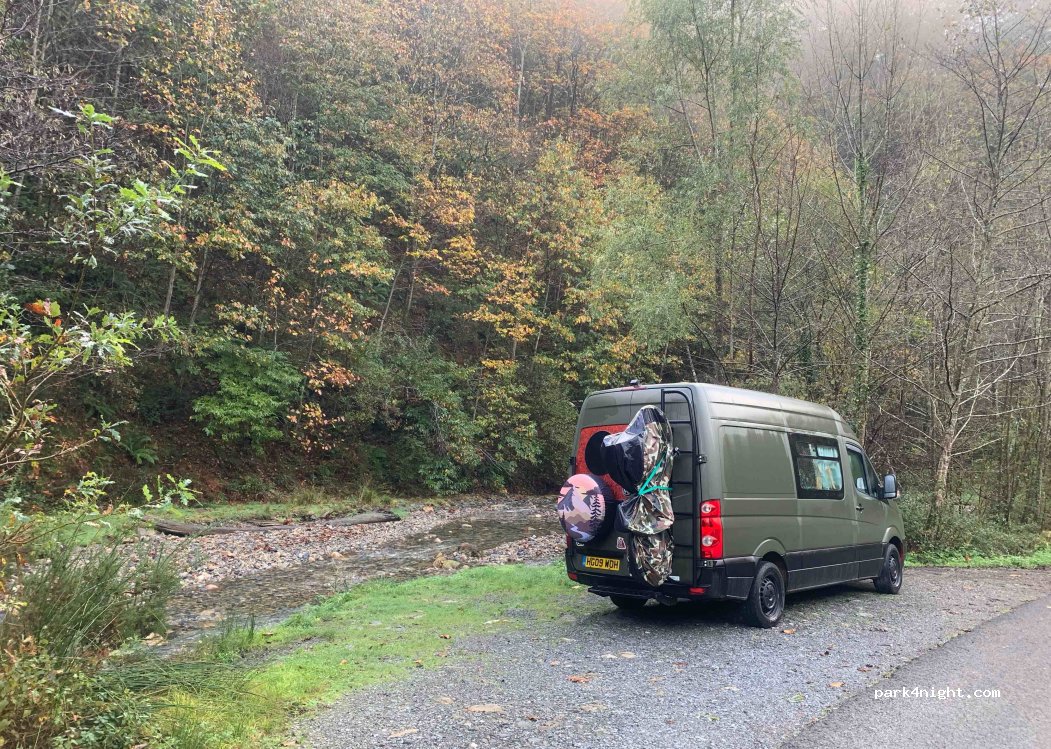 Nice little spot, there’s one flat spot which would for one van. Mine is 6m and was fine but took up nearly the whole spot. The coal mines are a short walk away which are really cool! Lovely right on the river and the road isn’t too busy. I stayed on a Friday&Saturday night with no problems.