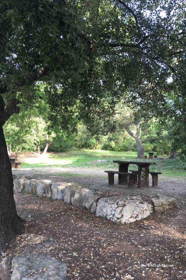 Aire de pique-nique à l’orée du parc de la Brague sur le bord de la route. Bien pour dormir une nuit, peu de passages de voitures mais ça reprend très vite le matin vers 7h (le week-end hors saison estivale)