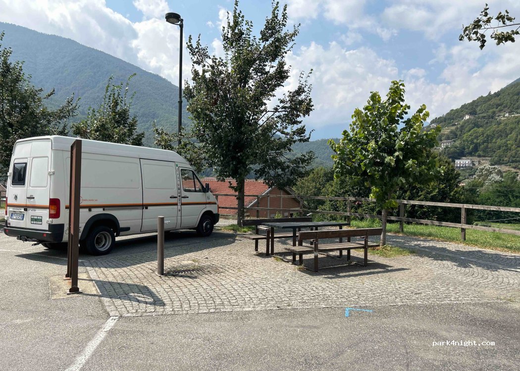 Precioso parking grande con árboles vistas al valle de Germanasca con posibilidad de vaciado, mercadillo los domingos por la mañana y mercadillo los miércoles por la tarde, bolera en la plaza con todos los servicios como duchas, bar y chiringuito preguntando en el House bar "La Perosina"