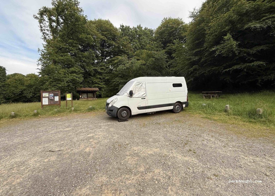 Parking légèrement en pente, au bord d'un étang (séparé par une petite route peu fréquentée) en pleine forêt, très tranquille, réservé aux amoureux de la nature. Grands choix de randonnées pédestres et VTT. Possibilité de pêche.
