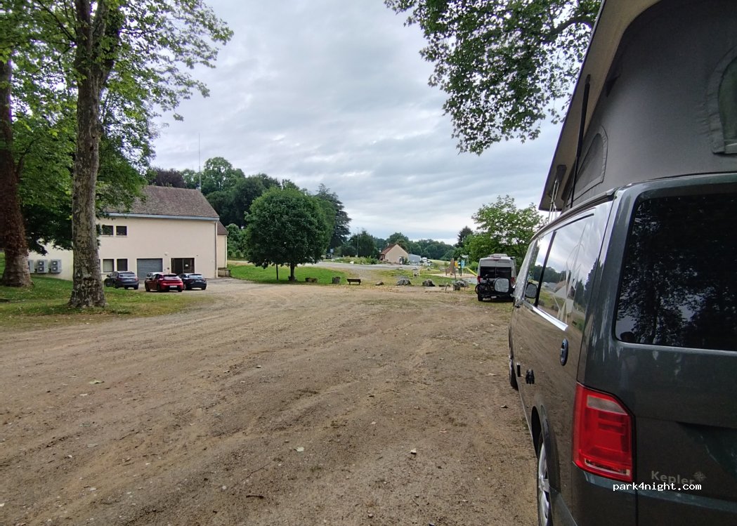 Great place for overnight stay. it is provided by the village (thank you). By a lake, very quiet at night with toilets, unfortunately they were locked, but it was December. Lovely bakery a couple of minutes walk to the village. It is a few minutes from A20 and if you're heading north you'll find a cheap petrol station, laundry and supermarket 2km away from the parking when heading towards A20.