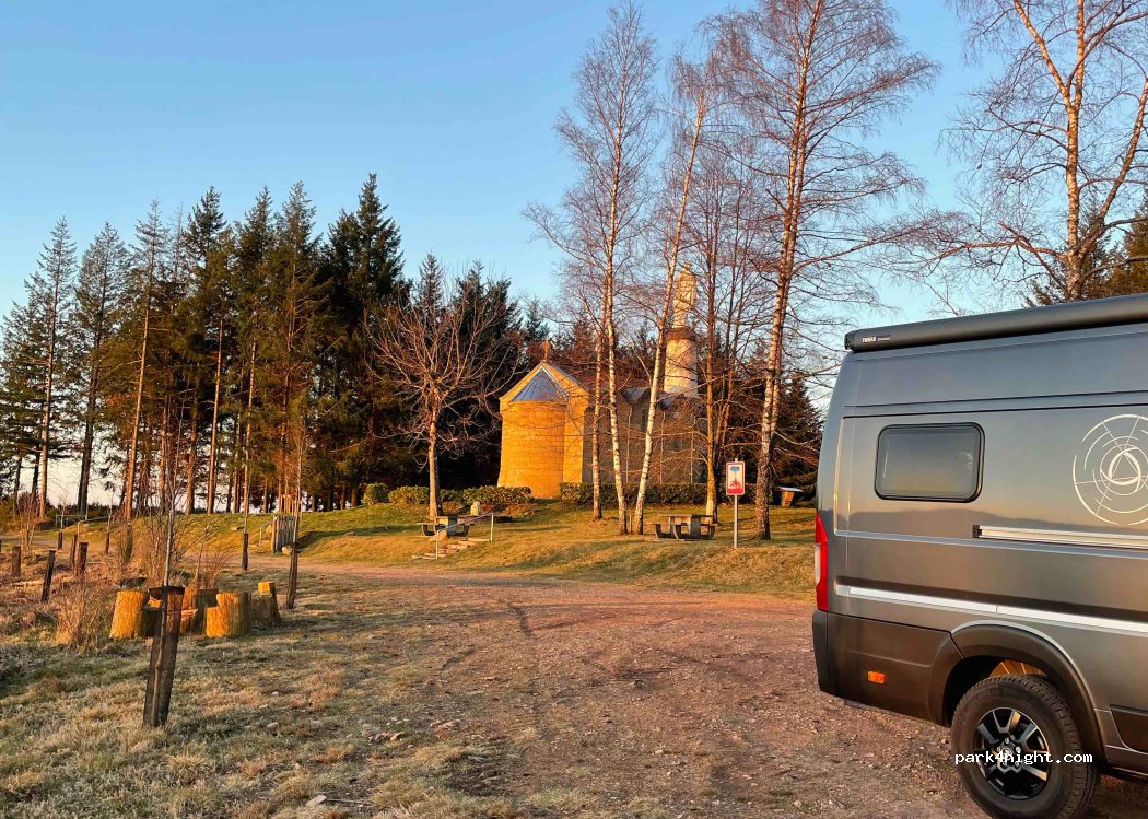 Parking à proximité d’une chapelle, accès via une route étroite mais praticable. Petit panorama à 100 mètres. Idéal pour une nuit. Poubelles à proximité.
