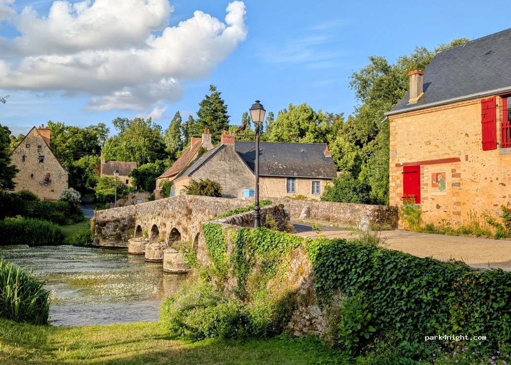 Parking in a beautiful, quiet setting, to visit the very nice village. Visit of the courtyard mansion in the afternoon. toilet water play area picnic table. near the river