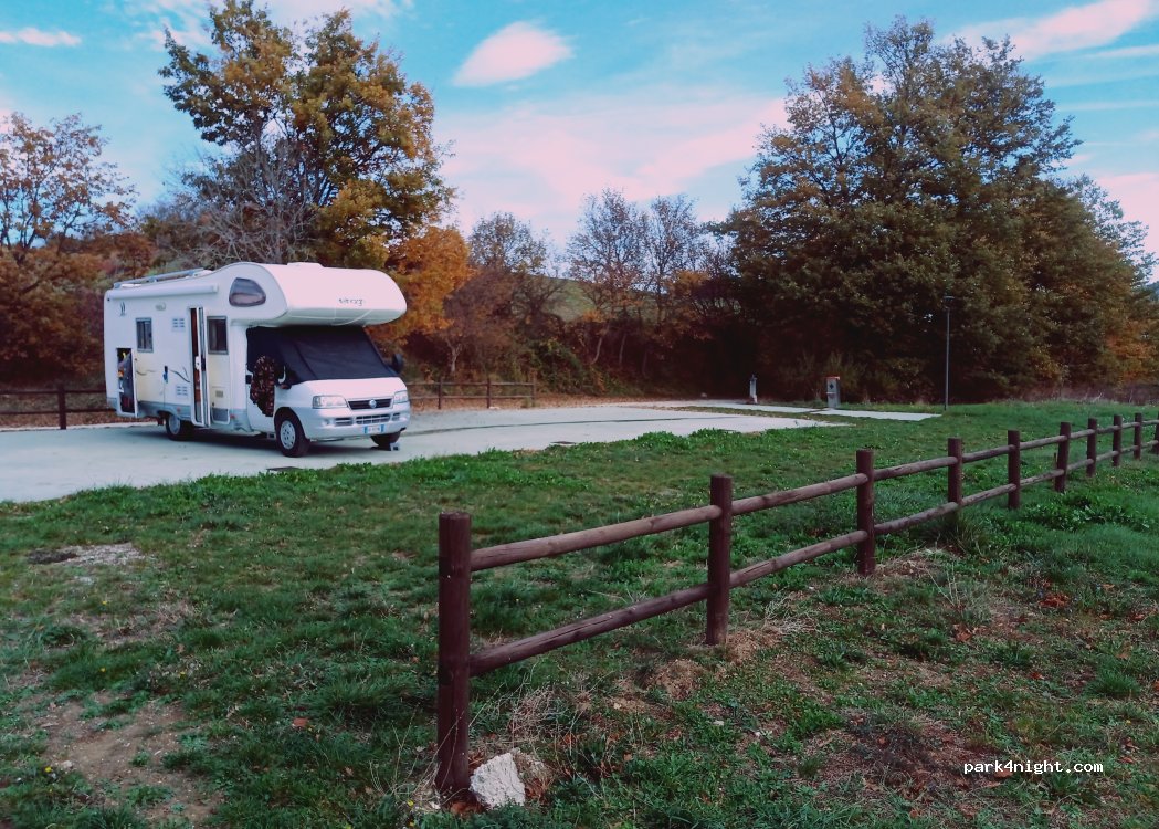 Luogo nel cuore degli Appennini, area sia su prato che su cemento non in piano ma con i cunei si risolve il problema, esiste anche piccola area giochi per bambini oltre che visita alle “cascate del verde” assolutamente da vedere!