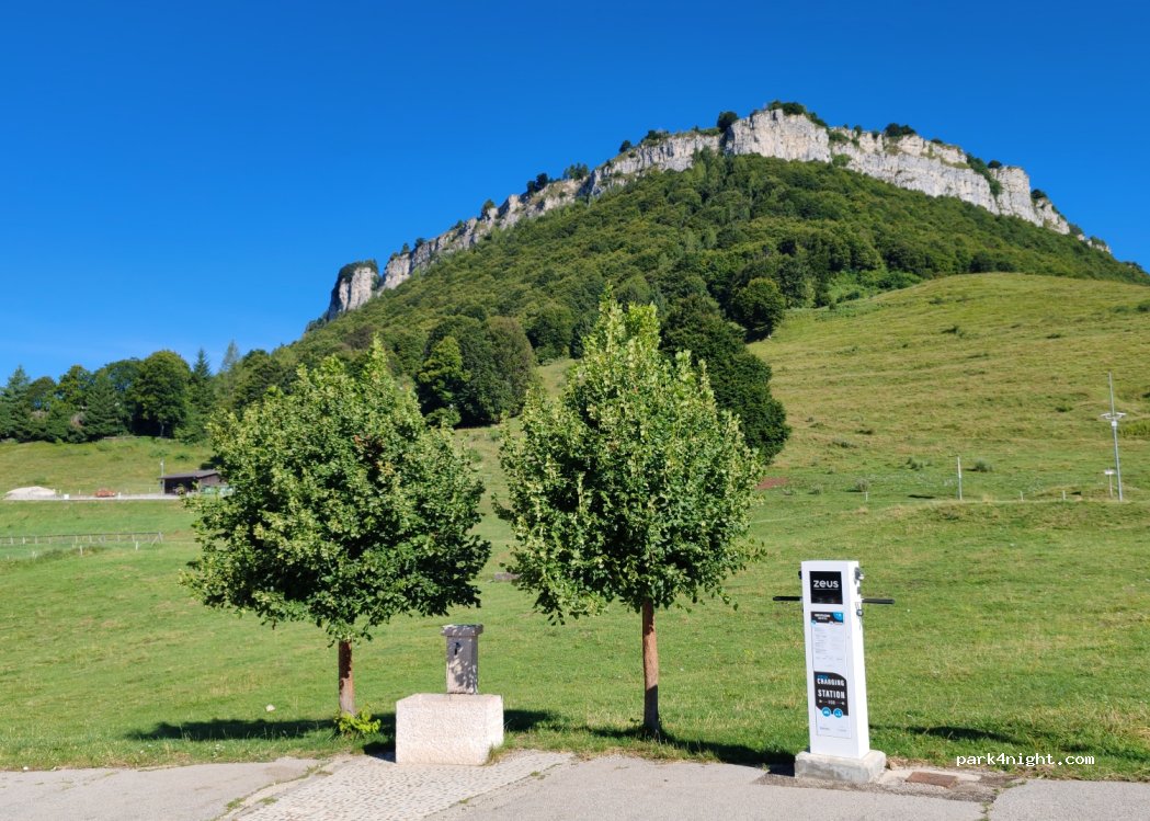 Vue magique! nous etions seuls sur se parking en Juin. Il y a une légère pente sur la majorité du parking mais quelques place sont à plats. Nuit très calme mais le restaurant en face étais fermé. Fontaine et table de picnic.