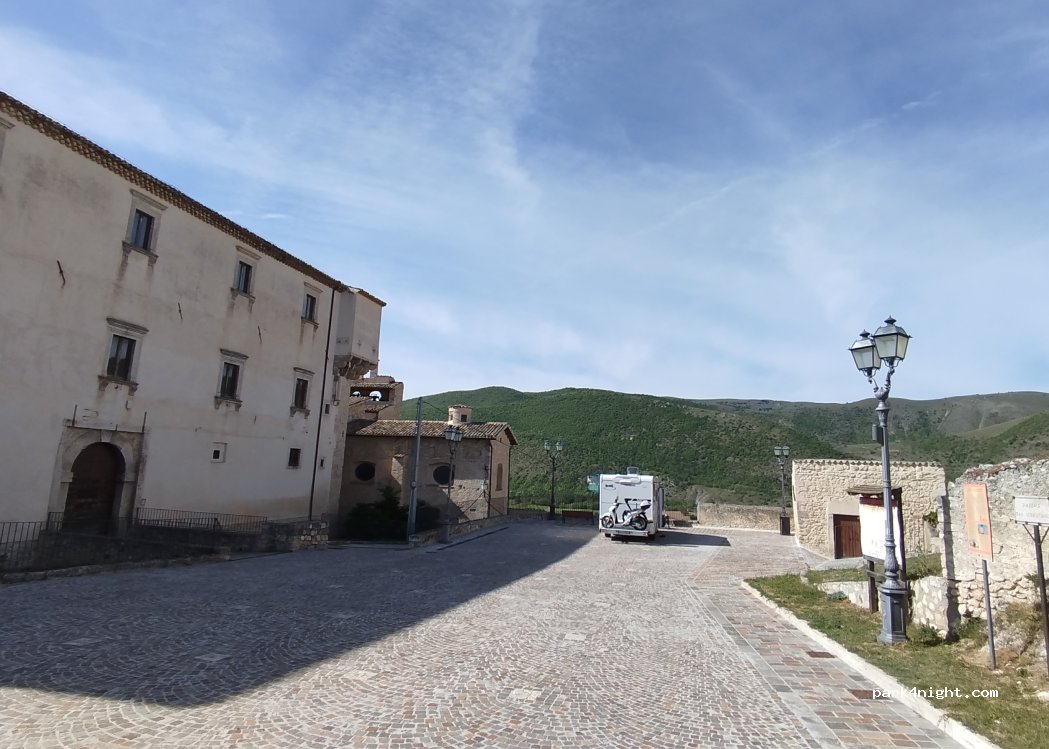 abbiamo parcheggiato qui in due camper, io più avanti proprio di fronte al bel.panorama. zona molto tranquilla e paese molto carino, da scoprire vicolo per vicolo...tutto molto bello...vi consiglio di gustare il menù a base di zafferano in una delle trattorie della zona...