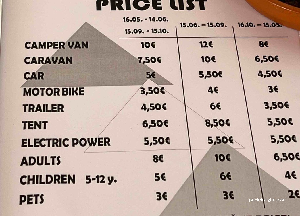 Great place, prices are like everywhere, in high season it was 37 euros for two adults, children under 3 years old are free. Toilets and showers are clean, there was never a queue as the camp is small. Everything is cozy and homely, very nice staff. The most important thing is that there is a sandy beach for children nearby.