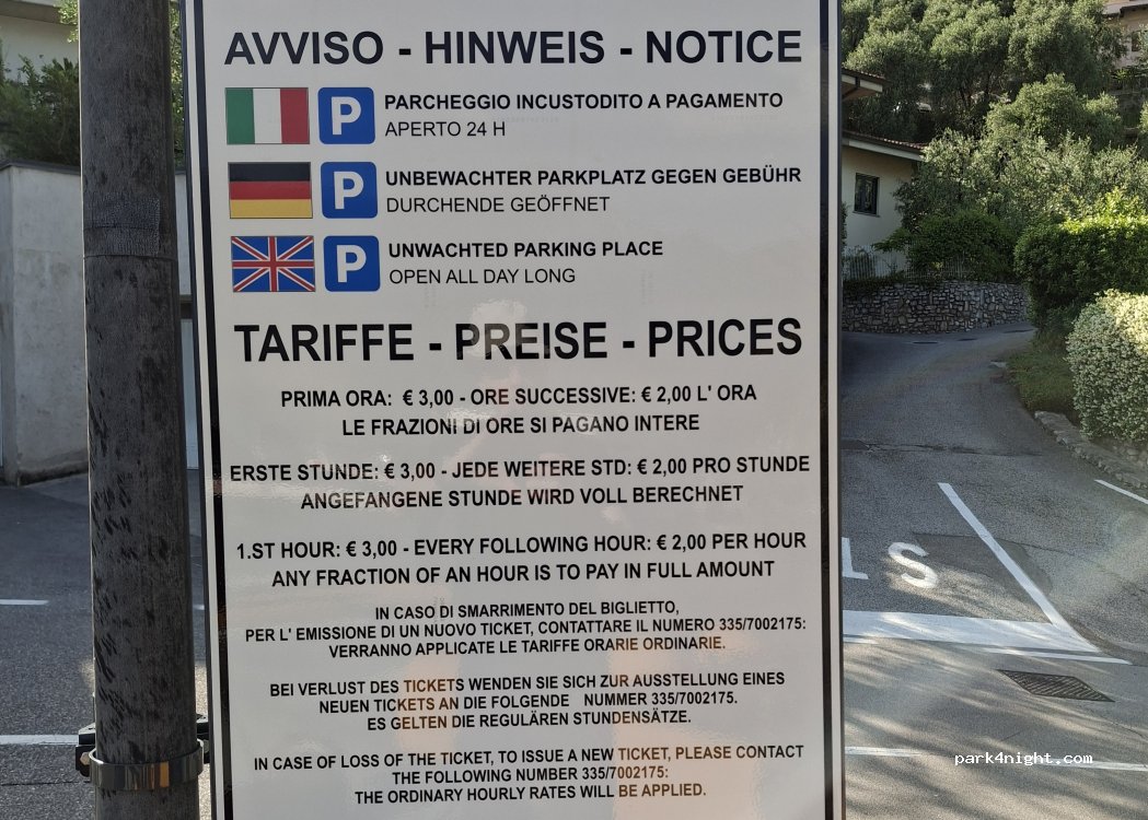 Ottimo parcheggio per van o piccoli camper, vista lago e centro paese a pochi passi. Non ci sono servizi con prezzo a ore. €. 2,50 la prima ora e €. 1,50 le successive. Dalle 23,00 alle 8,0o €. 1,00 all'ora. Visto la difficoltà di parcheggio, lo consiglio.