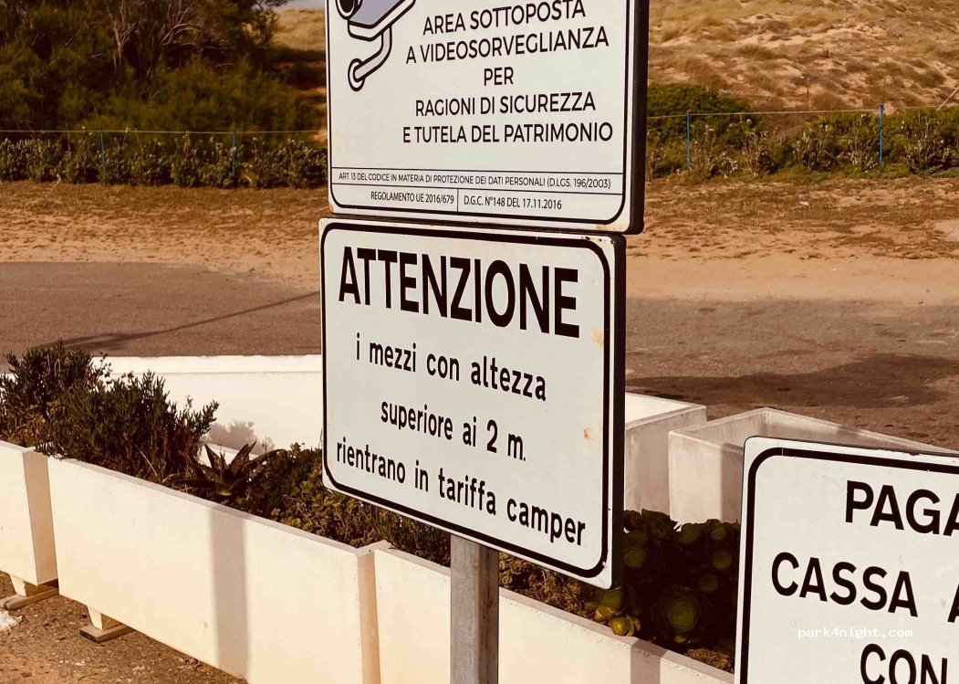Parcheggio tranquillo ma il bigliettaio di sua iniziativa chiede ai camper il doppio delle macchine perché più grandi...giugno abbiamo sostato giorno e notte 10 euro...silenzioso bella spiaggia nessun servizio