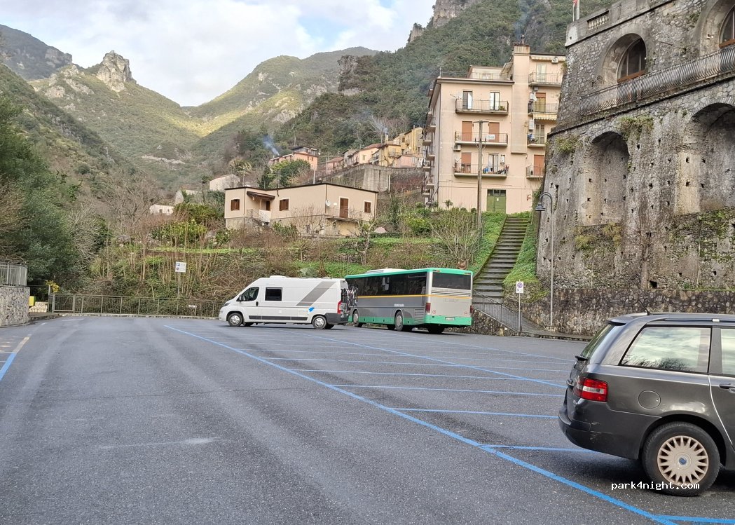 Grand parking très plat, très calme. Bar à coté avec wifi, dame très disponible et gentille. Très belle vue et belles randonnées à coté dans ce coin perdu du Parc National du Pollino. Attention, le jeudi matin, il y a le marché sur ce parking !