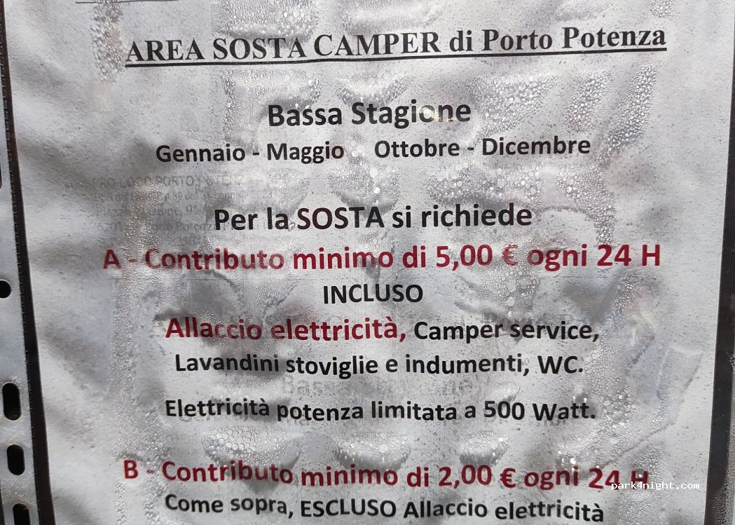 Dal 1 ottobre 2022 la sosta fuori stagione non è più gratuita. Viene richiesto un contributo di € 5,00. La corrente viene erogata dalle 13 alle 21 e a causa dell'aumento dei costi energetici è limitata a soli 500 W appena sufficienti per i servizi essenziali. Mare a 500m.