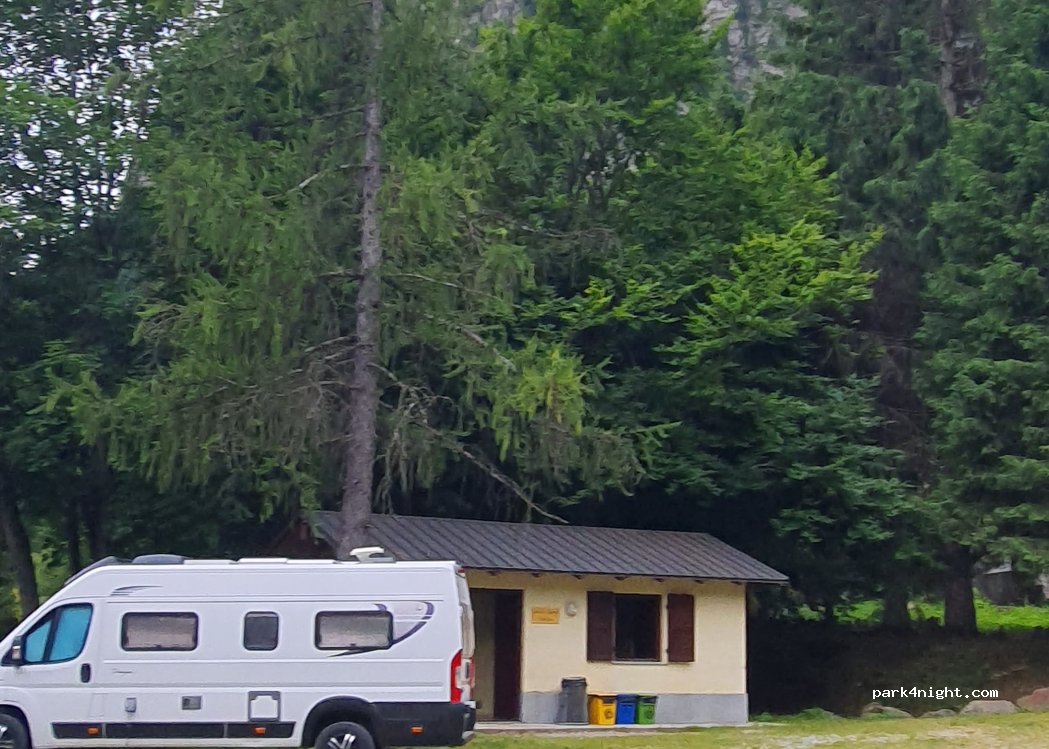 Vicino all'ingresso ci sono alcuni parcheggi leggermente terrazzati sotto gli alberi con l'allaccio luce e vicini ai servizi igienici, chiusi la notte, e agli scarichi delle acque, grigie e nere. Poco più sotto i parcheggi vicino al torrente sono più carini, ma non c'è allaccio luce. In estate a pagamento, 28€ per due notti e tre giorni. Personale gentile.