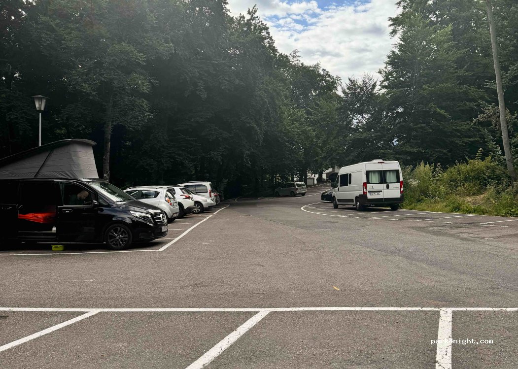 Guter Platz, jedoch laut, wenn im Vereinsheim Musik läuft. Alternative: Links neben der Einfahrt zum Parkplatz gibt es eine Einfahrt bergab direkt zur Sporthalle. Dahinter befinden sich weitere ruhige Parkplätze. Hier war es top!