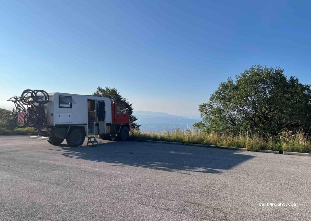 Wunderschöner, geteerter Stellplatz. Schlechter Empfang, das macht die sagenhafte Aussicht bis zur Adria aber wett. Eine gut ausgeschilderte Wanderung zum Gipfel ist möglich. Wir kommen wieder. Eine sehr ruhige Nacht hier verbracht.