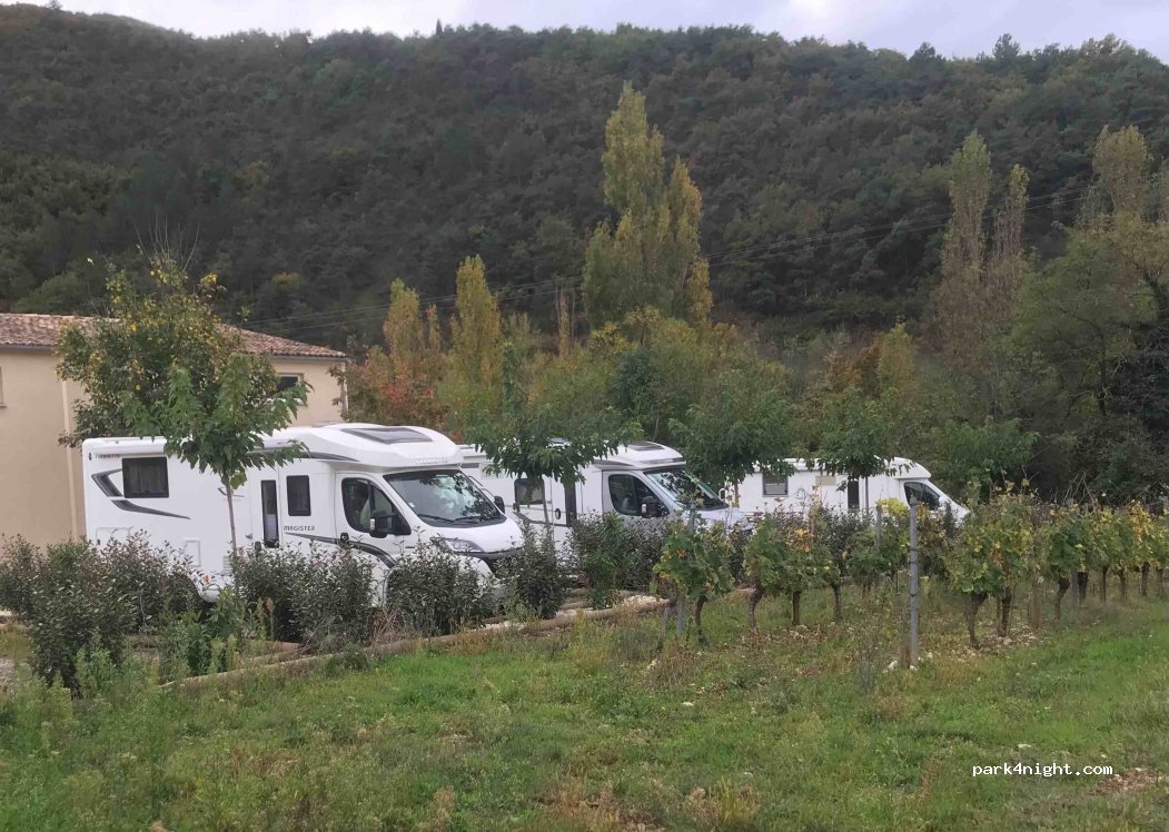 Zeer fijne overnachtingsplek; ‘s-nachts rustig, je hebt geen last van de doorgaande weg omdat je deels achter de Clairette & Cremant en stille wijnen cave staat. Superaardige wijnmakers en we hebben genoten van een heerlijke fles bio-bubbels die ze in de koelkast hebben staan.