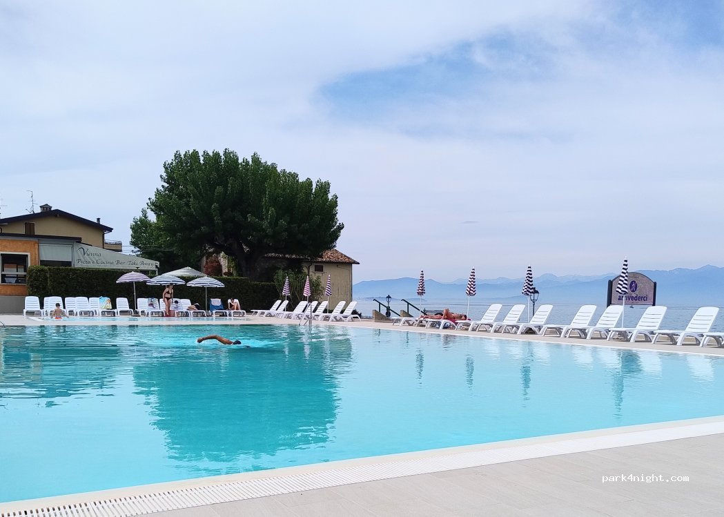 Camping avec piscine ouverte de 10 à 19, donne directement sur le lac plage assez étroite toitefois. Excellent restaurant à proximité, veccio Mulino beach. Prix élevé, 22€ pr le van plus 15€ par personne.