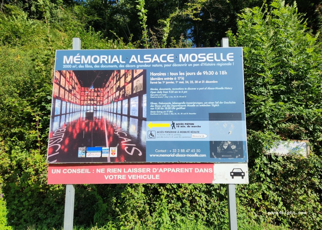Parking du Mémorial de Moselle/Alsace. Pas d'interdiction. Spacieux, pas de commodité. Nuit possible. Barbecue aussi. Les enfants peuvent jouer sur le parking sans inquiétude. Visite du Mémorial très instructif.