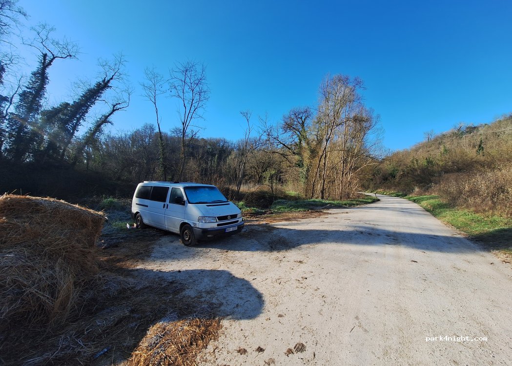 Clearing off a dirt road in the countryside, 15min drive from Siena. Summary but clean and quiet, we spent a quiet night under the stars. The path leading to homes, the passage of vehicles has increased from 8-9am (5-6 cars per hour).
