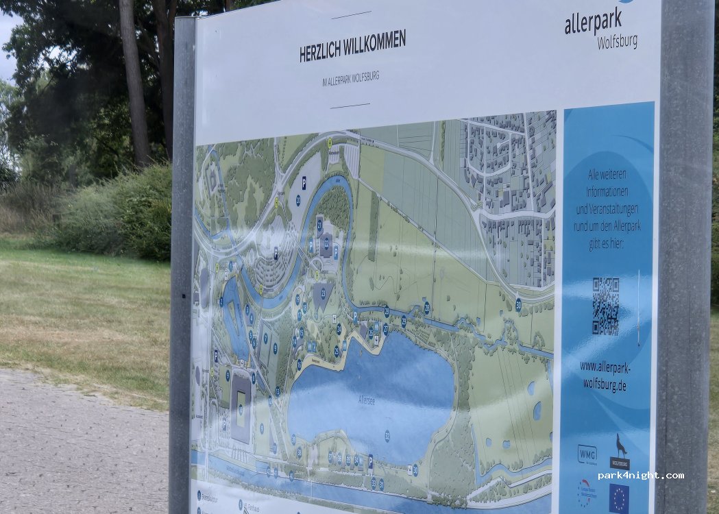 This parking is right next to the camping ground. Available 24/7. Quiet nice place very close to the lake. Wc is 300m far from the parking. We’ve stayed here for 3 days and nights. VW arena is 5min walking, VW museum 500m, Autostadt and supermarkets at about 1,5 km