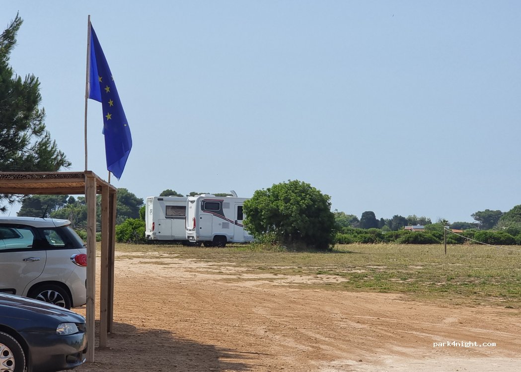 Ampio parcheggio su battuto di terra, al sole. Buona posizione per raggiungere la bellissima spiaggia di Torre dell’Orso, passando attraverso una pineta. Abbiamo pagato € 5,00 per tutto il giorno. Ci hanno detto che non è possibile restare la notte. Nessun servizio.