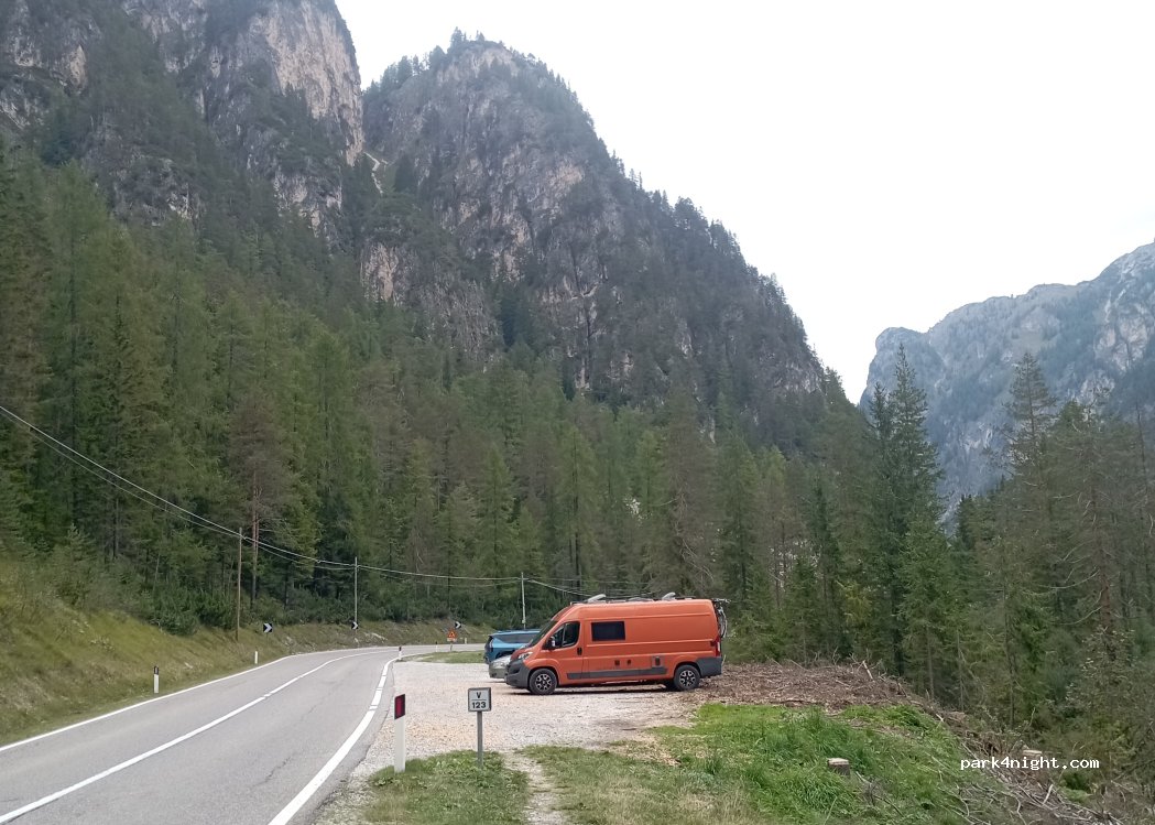 This is a good sized lay-by just up the road from a large pay & display car park which doesn’t allow overnights. It’s just off the road but it’s not too busy or noisy. There is actually another identical lay-by slightly closer to the car park also. There are WC’s just at the front of the car park but also woods all around - just bury it!! There’s a large restaurant nearby and a lake up the road also but it isn’t great for swimming (clay floor). This is a great stop for hikes up to the Tre Cime/Drei Zinnen.
