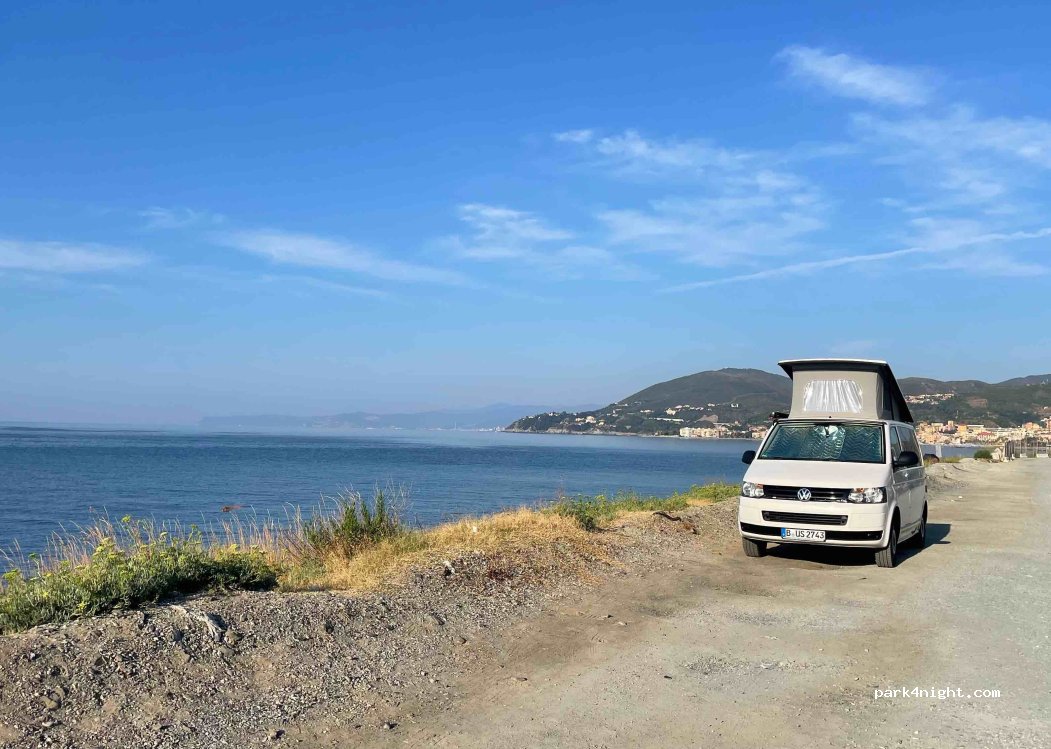 We have been here for a night with our VW T5. The place is amazingly quiet and you have direct access to the sea for a morning swim. We parked the camper directly on the water, next to the football field. Nobody complained. The height limit barrier was put to the side. So in principle larger cars (>2m) could stay here overnight.