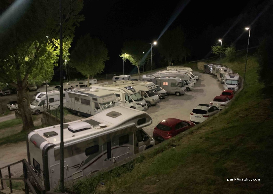 Parcheggio a 10 min a piedi dall'ingresso alle mura della città, comodo e gratuito. Tranquillo per la notte. vicino c'è anche un supermercato Conad. Abbastanza in piano. sono 3 livelli quello sotto è area per i bus turistici.