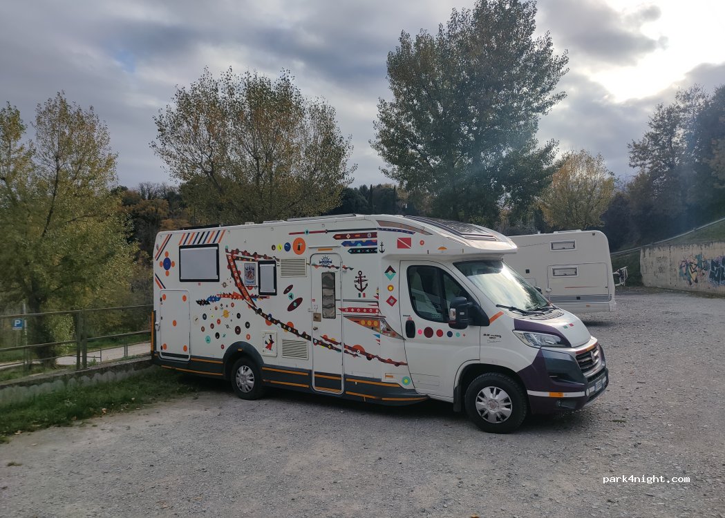 Parking gratuït sense cap tipus de servei. Ens vam sentir segurs que ja van dormir amb 5 AC més. A 10 min a l’entrada de la ciutat històrica, on hi ha un punt d’info turística. Important! Els dijous pel matí fan mercat al parking de pagament situat just a dalt (s’accedeix per unes escales) i aquest s’omplena fàcilment de cotxes.