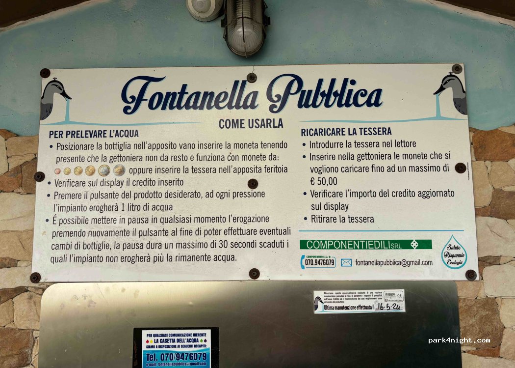 instalaciones de agua y electricidad abandonadas de lo que fue un Área de Autocaravanas, pero dormimos tranquilos y acompañados por otras campers y camiones. Hay una máquina expendedora de agua potable muy buena para beber a 5 céntimos el litro y viene la gente del pueblo a llenar sus garrafas. Es un buen lugar para dormir a media hora de Cagliari