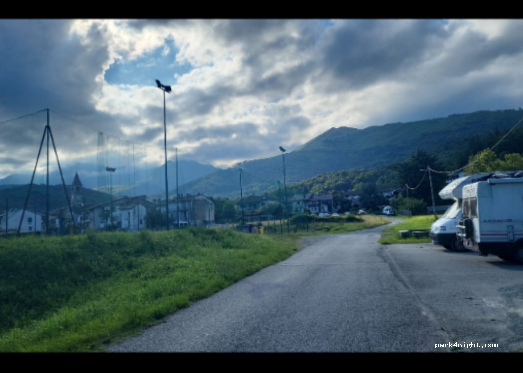 Kommunaler Wohnmobilbereich. weit von der Straße, aber ohne Schatten. Es besteht die Möglichkeit, Strom zu bezahlen und Wasser an der Bar zu erfragen. Schöne Aussicht auf die Berge und sehr ruhiges Dorf. Freundliche Einheimische vor allem mit Hunden. In der Nähe von Waldwegen und Mountainbike-Strecken. Internet 3g