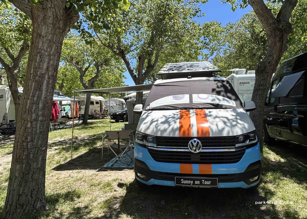Bardzo przyjemny camping. Duże, zaciemnione parcele. Dwa duże pomieszczenia sanitarne. Schludne i zadbane. Jeśli ktoś dostanie ostatnie miejsca pod płotem, minusem może okazać się kurujący pociąg, oraz duże, latające noce owady, które mają swoje gniazda w drzewach, które jednak nie atakują ludzi. Plaża po drugiej stronie ulicy, a wzdłuż drogi sporo sklepów i restauracji. 2 os+camper 23€