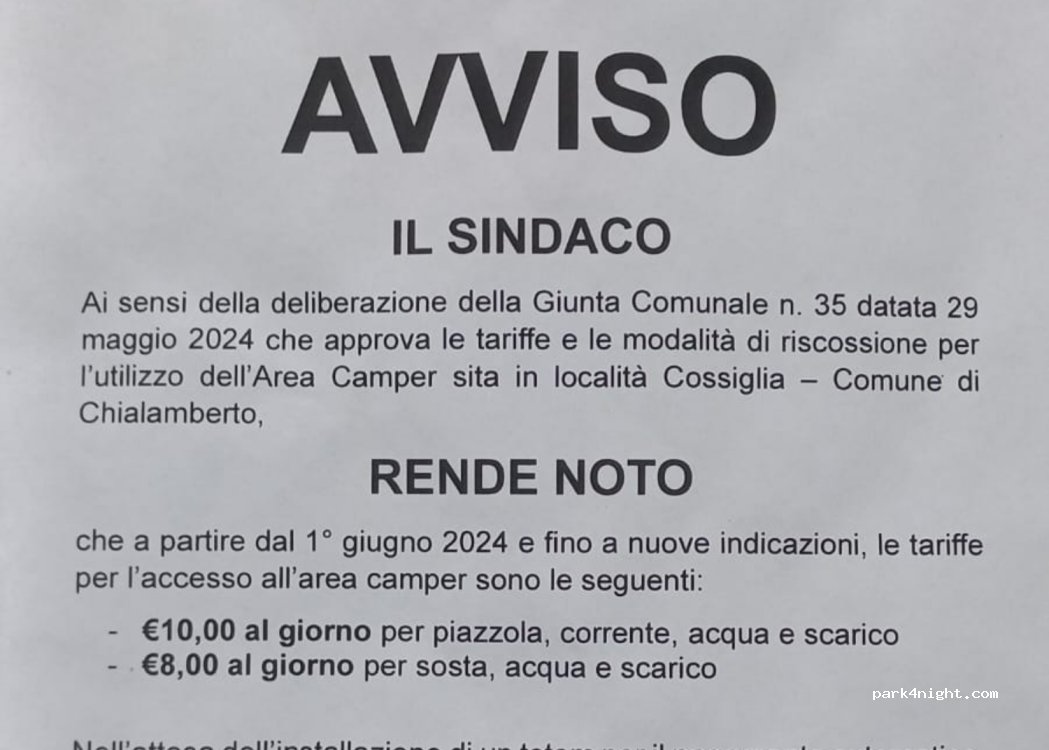 E la prima volta che vengo in questa aria camper,molto bella tranquillità e ben curata con acqua scarico e luce,bella panoramica,grazie al comune di Chialamberto per il vostro servizio. Torneremo di sicuro.