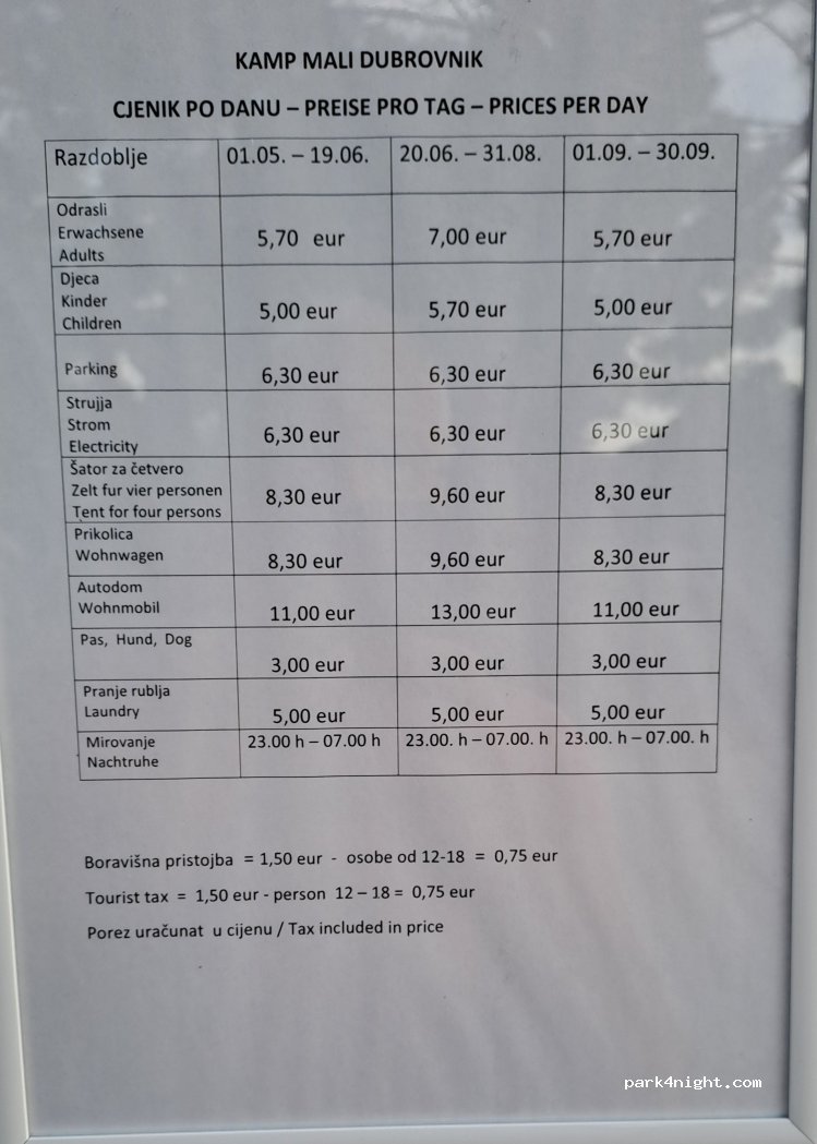 Accueil et sanitaires formidables ! Bien placé par contre nous n’avons jamais payé autant de taxes sur toute la Croatie !!!!!!19€ avec Acsi, en fait nous avons payé 26€ avec toutes les taxes!!! C’est exagéré ! Dommage nous ne reviendrons pas… pas de possibilité de TV