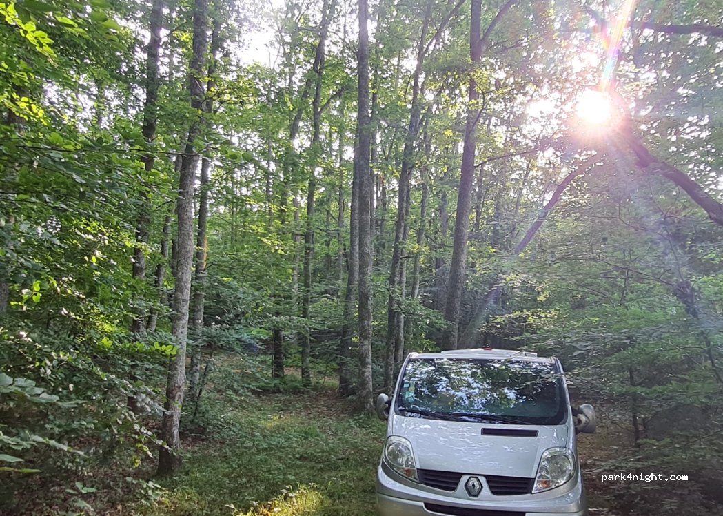 Emplacement au bout d’un chemin-impasse réservé aux chasseurs. Bon pour une nuit en pleine forêt. Prendre le chemin forestier et premiere à gauche une fois engagé. Il faut faire 50 m sur un chemin qui conviendra mieux aux vans. J’y suis monté avec un intégral mais c’est juste ! (Surveiller les branches basses). Calme et aux milieu des chênes.