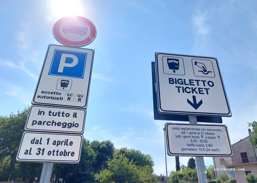 Parcheggio attaccato al paese e in meno di 10 min al percorso naturalistico, la sosta si paga solo dal 1/04 al 31/10. Abbiamo trovato la macchinetta spenta. Tariffa giornaliera 10€ mentre oraria, confermo 2€