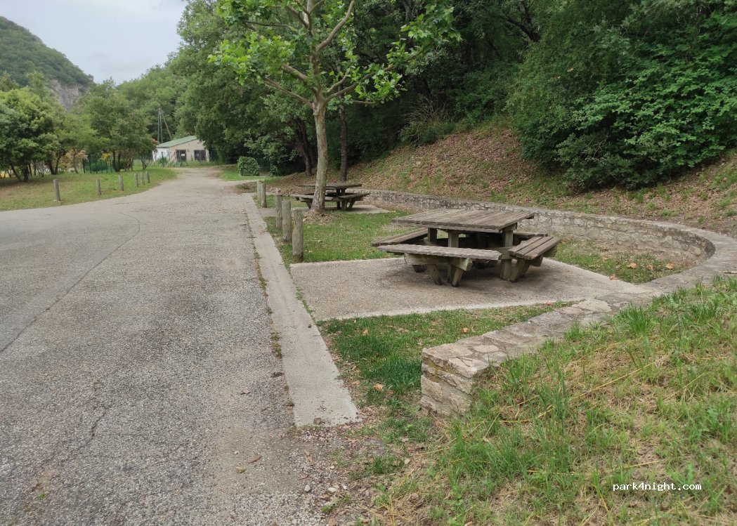 très chouette zone paisible pour un pique nique mais pas de poubelle. possibilité de stop avec un groupe accueilli sur un petit muret à côté de 2 grandes tables.