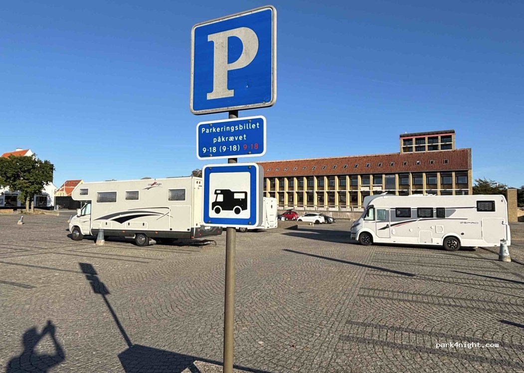 Costoso: 205 DKK dalle 23 alle 7, poi tariffa oraria. (vicina area di sosta poco più di 200DKK per 24h). Parcheggio centrale per visitare la città; rumoroso di notte, molto rumoroso al mattino. Spazi sosta per auto adatti per piccoli van fino a 6 metri. Non adatto a camper. Spazio per camper indicato da cartello. Attenzione sosta con EASYPARK fornisce informazione errata (no 24ore)