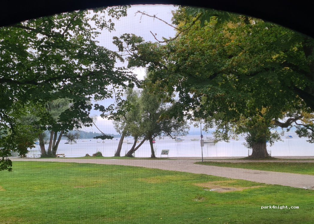 Super Parkplatz mit Seeblick. Von 18-09Uhr Gebührenfrei. Polizei war während unseres Frühstücks auf dem Parkplatz, hat aber nichts gesagt. Verkehr und vorbeifahrende Züge hörbar aber Okay. Keine Sanitäranlagen oder andere Versorgung.