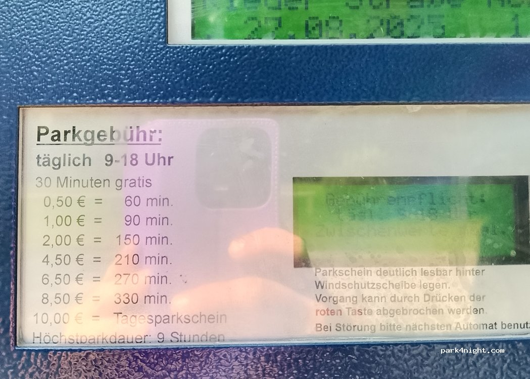 Wir kamen um 17:30 an & mussten nichts mehr bezahlen (30Minuten kostenfrei). Es wird aber kontrolliert. Sehr ruhiger Parkplatz. Toiletten haben wir neben dem Restaurant genutzt, die waren aber nicht sauber. Für eine Nacht völlig in Ordnung.