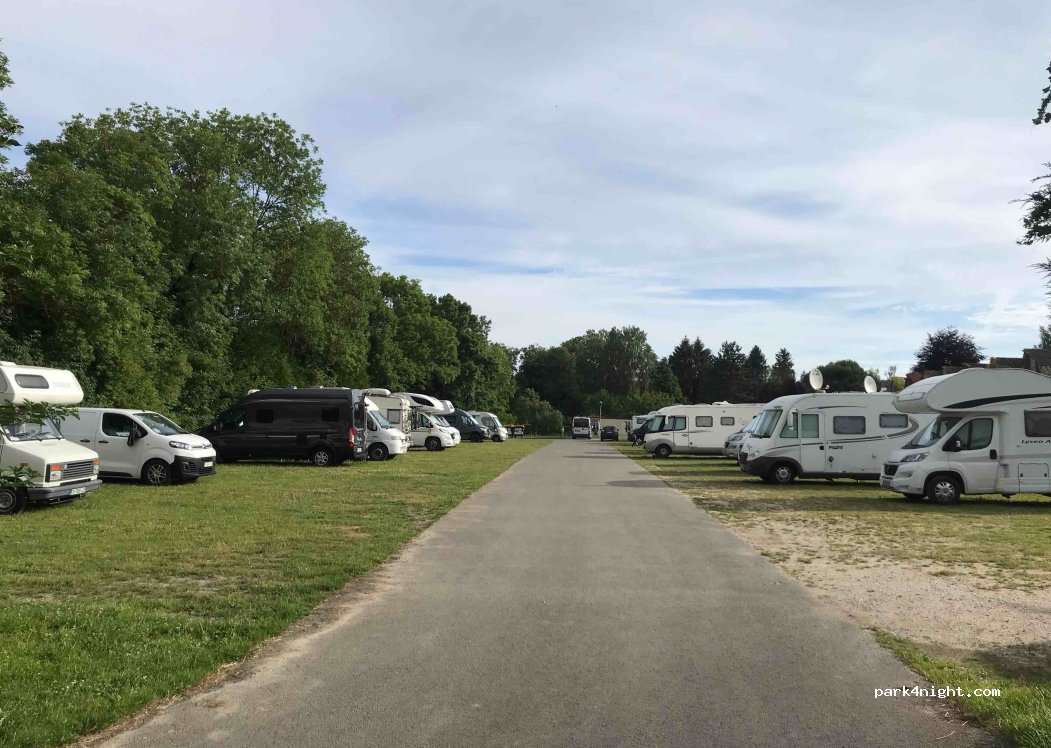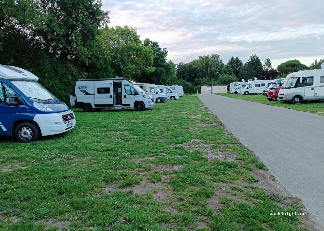 Grande aire sur herbe, proche du centre équestre, calme et proche des commerces du centre ville. aire de service à 3€ seulement Une bonne étape !!
