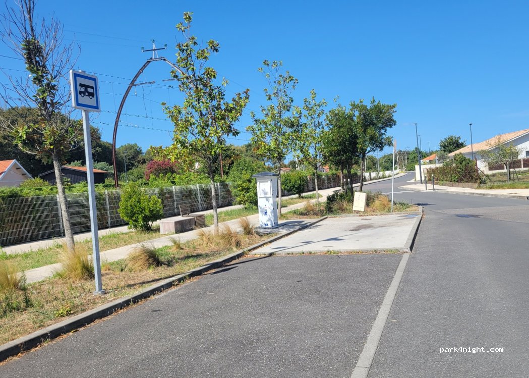 c'est un lieu de vidange uniquement,endroit propre, pas d'eau dommage... mais ! si vous allez au port du teich il y a des emplacements pour la nuit gratuit et surtout, il y a sur le premier parking un robinet d'eau pour faire le plein avec une bonne longueur de tuyau et un stationnement ponctuel un peu juste. De plus sur le port se trouve WC et départ de balade à pied ou vélo.