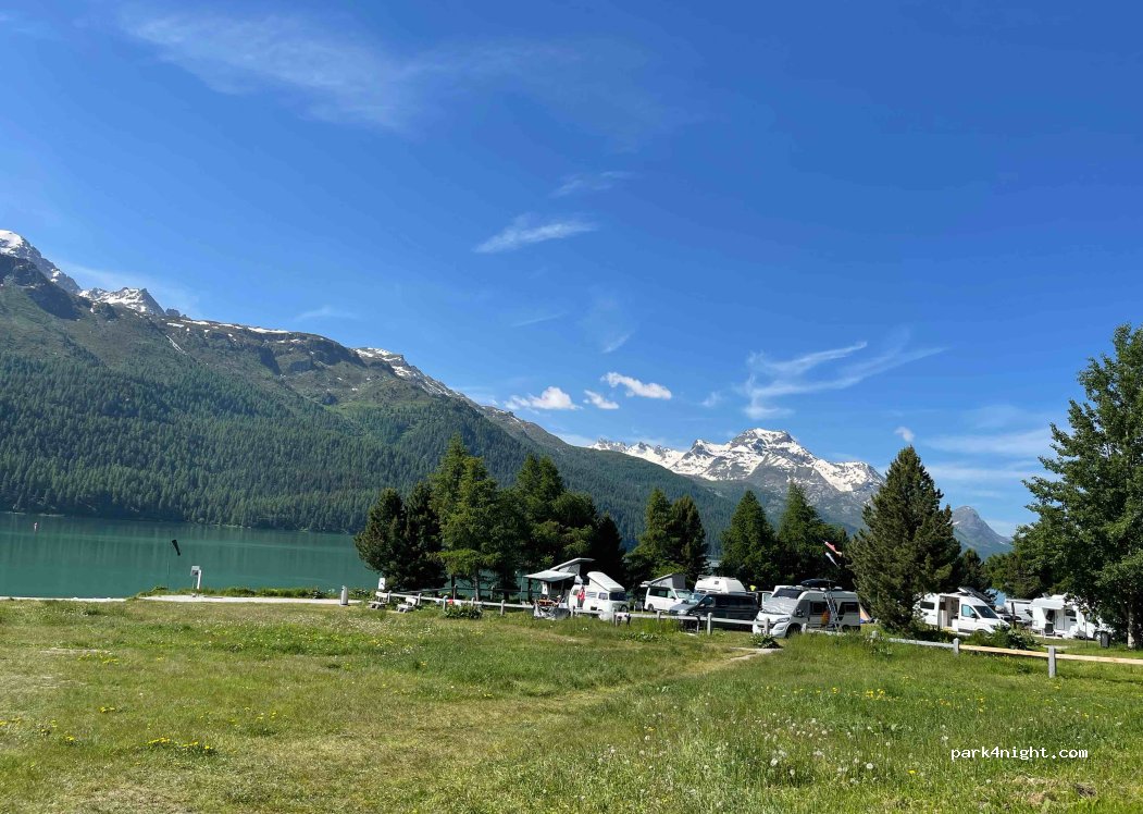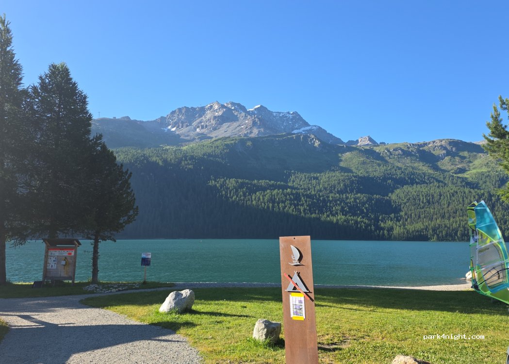 Ottimo campeggio sulle rive del lago di Silvaplana. Spiaggia, ciclismo, escursioni a piedi, vela e soprattutto kite surf su un lago molto frequentato da forti venti. Servizi di altissima qualità, ottima vista sul lago e sulle vette. Possibilità di lunghe passeggiate in bicicletta. Il campeggio accetta cani al guinzaglio.