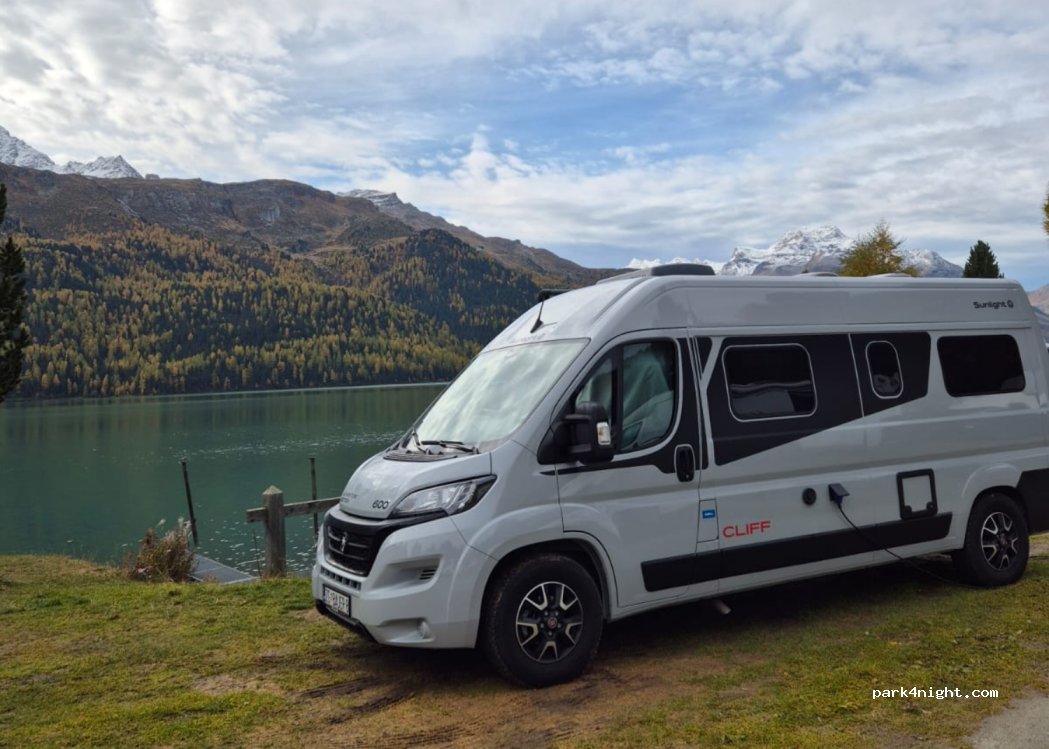 Excellent campsite on the edge of Lake Silvaplana. Beach, biking, hiking, sailing and especially Kite surfing on a lake very taken by high winds. High quality services, excellent views of the lake and peaks. Possibility of long bike rides. Camping accepts dogs on a leash
