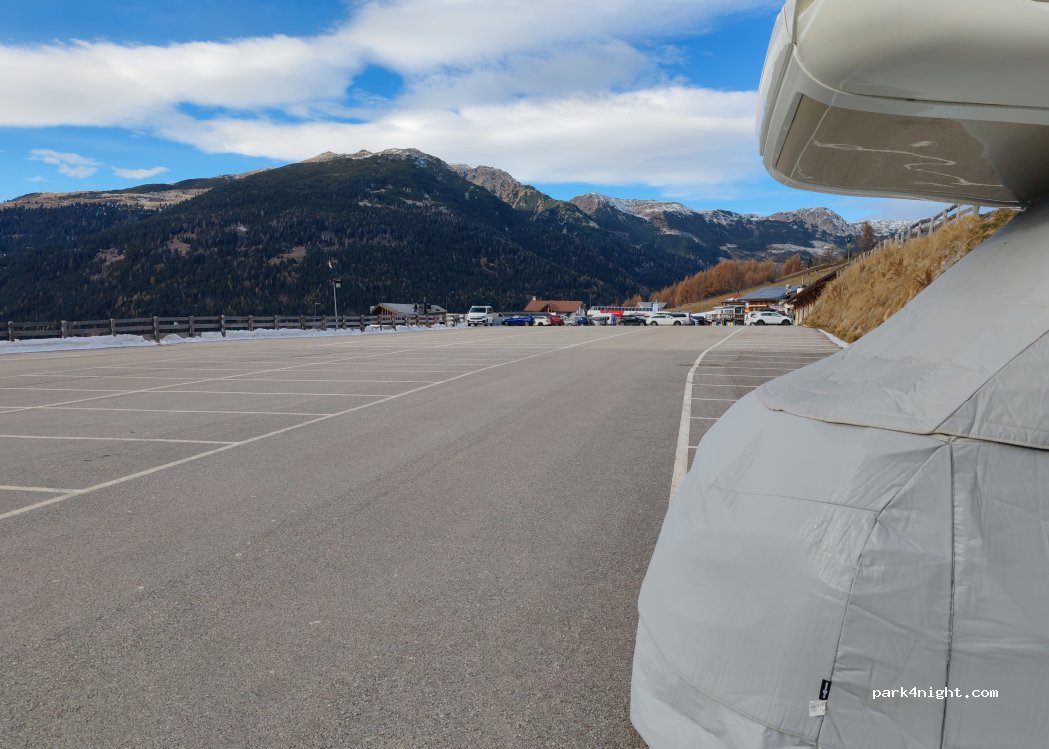 The parking lot is located at 1,500 m altitude at the Reinswald gondola. At the end of the parking lot is plenty of space for campers of all sizes. The view of the Sarntal and the surrounding mountains is amazing. There is only one toilet at the gondola, no disposal and supply. There is also no grocery store in Reinswald. At the parking lot there is a snack bar and a restaurant. Good hiking possibilities are available.