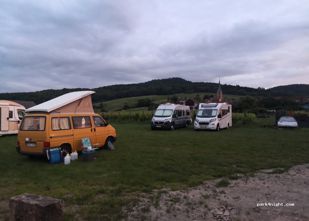 Très bon emplacement pour 6-7 campeurs / camping-cars à la cave Spitz. Les emplacements sont situés directement derrière la maison dans la prairie de la cave, directement aux vignes. Espace de stationnement gratuit, on ne demande que des informations courtes dans la boutique de vin. Ici, vous pouvez également acheter votre propre vin, mais ce n'est pas un must. À la vinothèque se trouve également un puits avec une connexion d'eau douce, où vous pouvez également obtenir de l'eau sur demande. Dans le village, à environ 3 minutes à pied ou à vélo, c'est un très bon restaurant avec une cuisine alsacienne ( réservation)