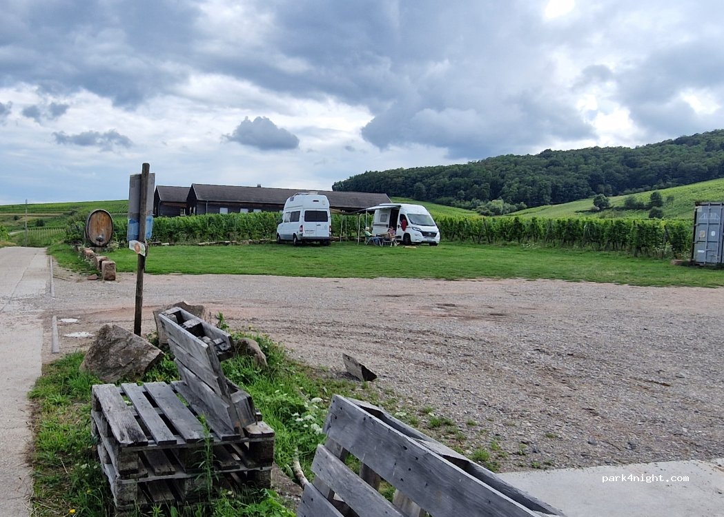 Very good location for 6-7 campers / motorhomes at the Spitz Winery. The pitches are located directly behind the house in the cellar meadow, directly to the vineyards. Free parking space, we only ask for short information in the wine shop. Here you can also buy your own wine, but it is not a must. At the vinotheque is also a well with a fresh water connection, where you can also get water on request. In the village, about 30 minutes on foot or by bike, it's a very good restaurant with Alsatian cuisine