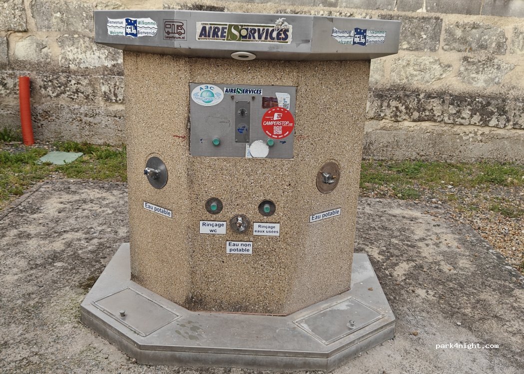 Aire top calme Nouveau concept : l'eau potable desservie juste au-dessus de la trappe de vidange cassettes wc ! Sans doute une erreur... La Wi-Fi gratuite communale arrive péniblement mais si besoin, ne pas hésiter à se déplacer en bord de Loire. Il y a même des "chocolatines" à la boulangerie. Enfin, il faut les demander ;)