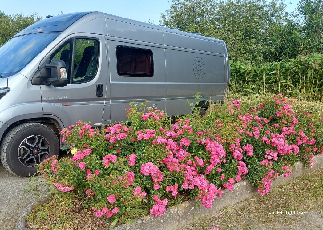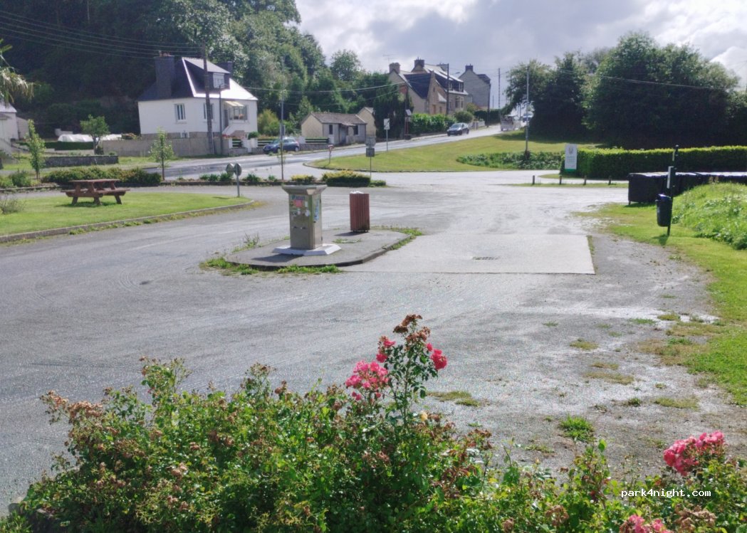 Aire très bien aménagée, avec une dizaine de places joliment délimitées. services payants Crêperie le Rozell non loin super. Merci beaucoup à la municipalité.